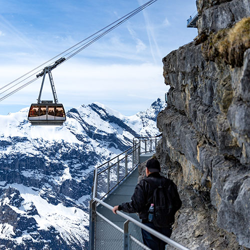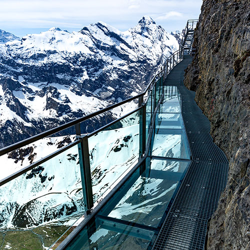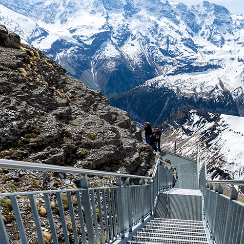 We gathered the troops and headed down to Birg, the third stop up. There is a thrill walk and we decided to check it out. Henri, Dick and I went on the path that wrapped around the mountain, and it was a bit nerve racking. I was too preoccupied to feel sick from the espresso I enjoyed at the cafe in the Schilthorn. The floor was a grate mesh with nothing below you. Sometimes there were clear panels in lieu of grates.