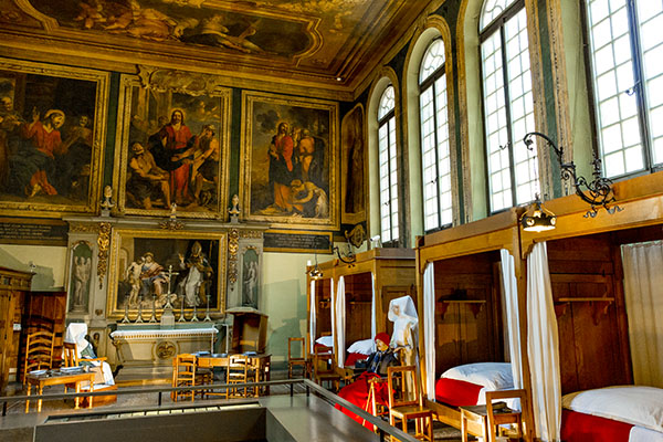 We went off to see the Hôtel Dieu de Beaune (Hospices de Beaune). The chancellor, Nicholas Rolin, founded this hospital for the poor in 1443. It had a large wing for the poor and a small wing for the wealthy patrons.