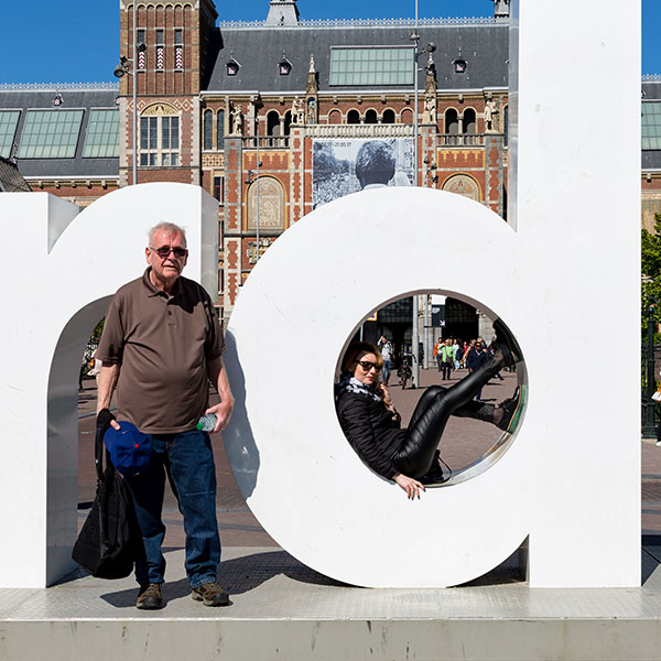 Outside of the Rijksmuseum is the famous “I Amsterdam” sign. I wanted to take dad’s photo in front of it, but there were a lot of people. I asked dad to go up there, and he stood next to this pretty girl inside the d letter....