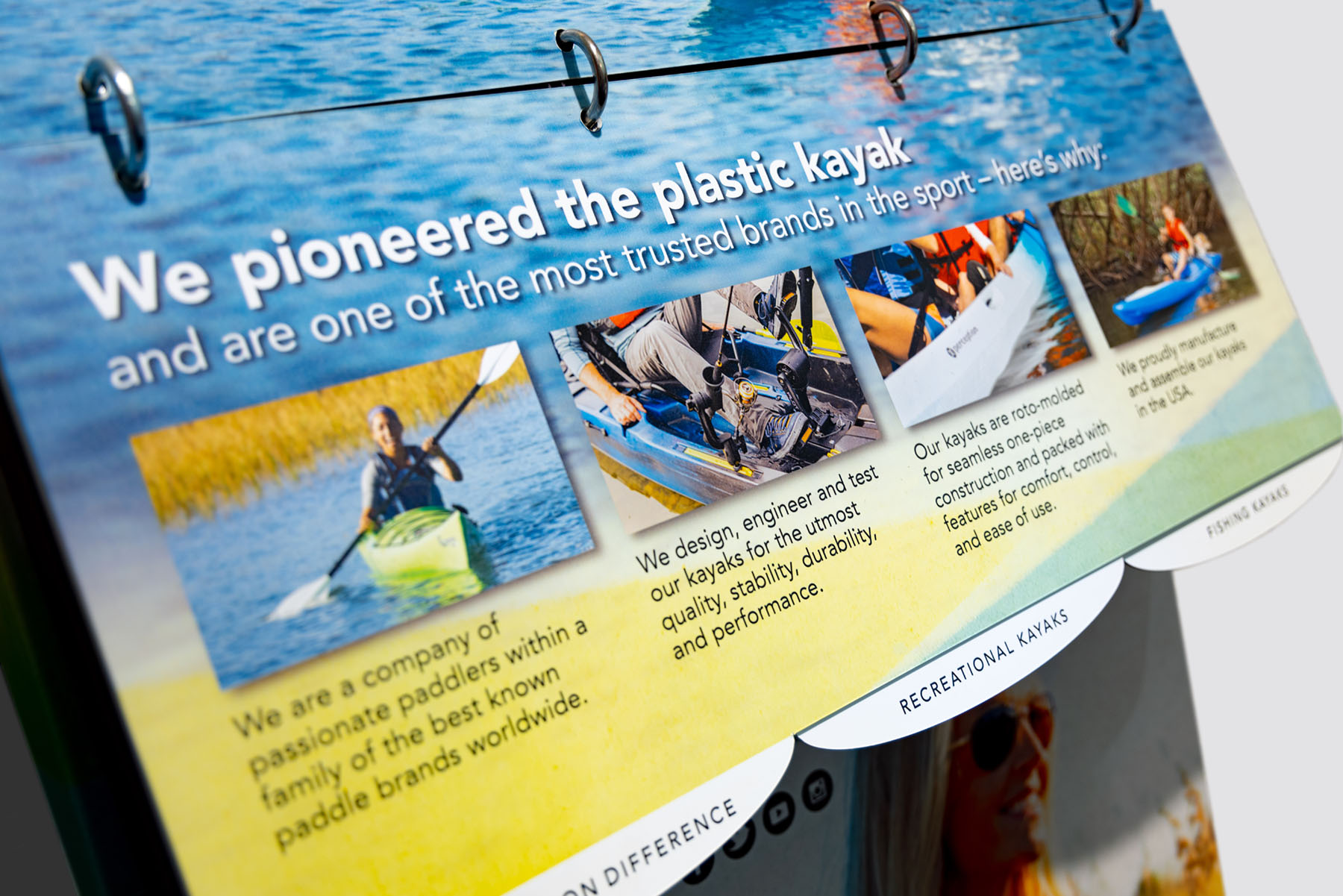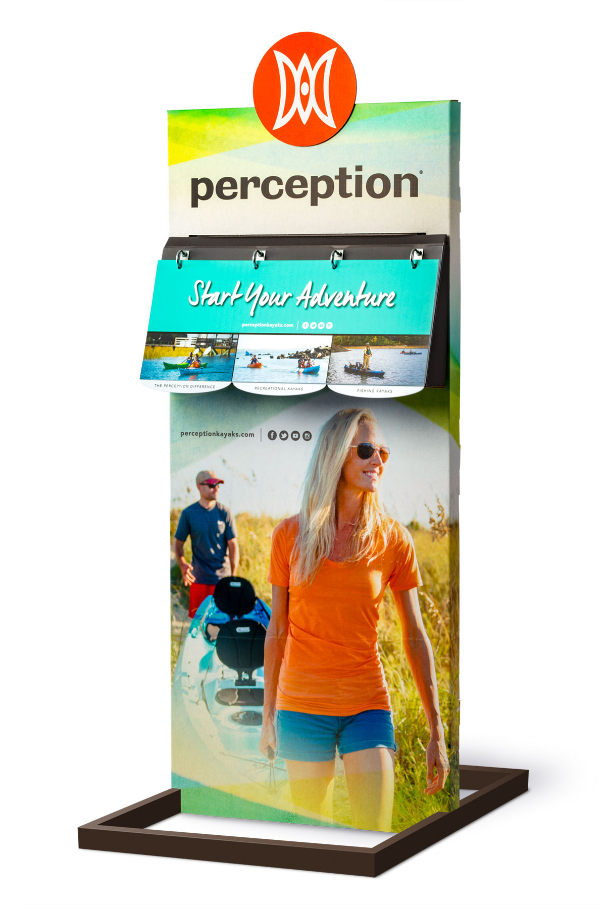 The client wanted help selling their top end kayaks in Dick’s Sporting Goods. We developed an engaging display that would highlight the features that set Perception Kayaks apart from the competition. We utilized an existing store structure, and I created the die for the display shroud and flip book holder.