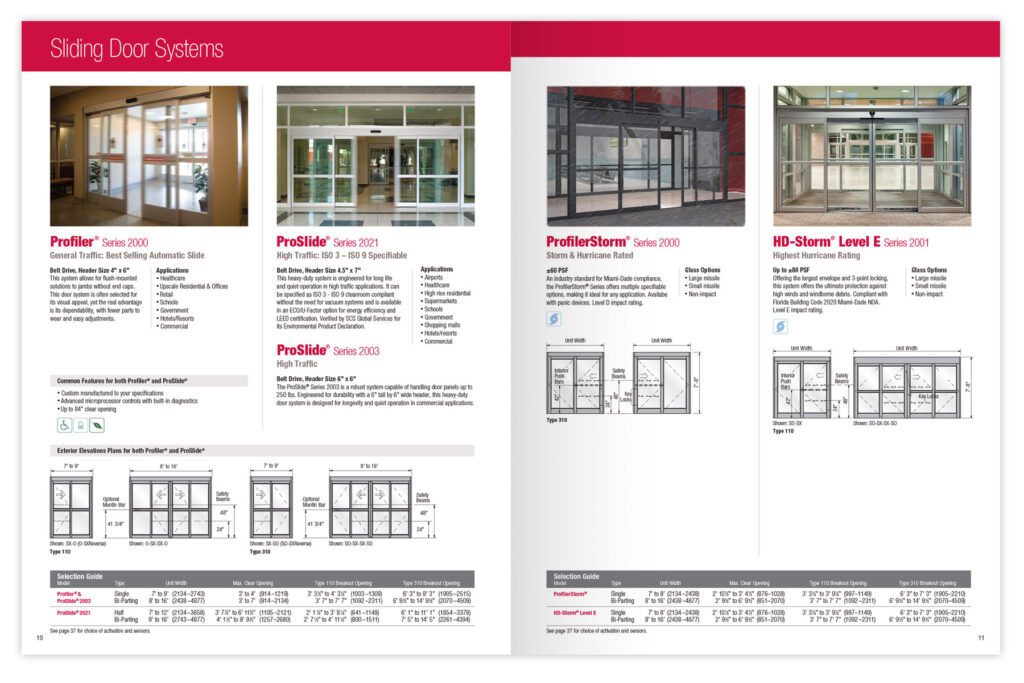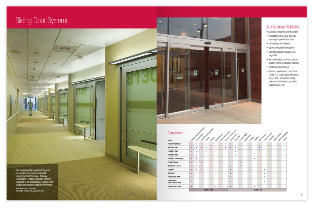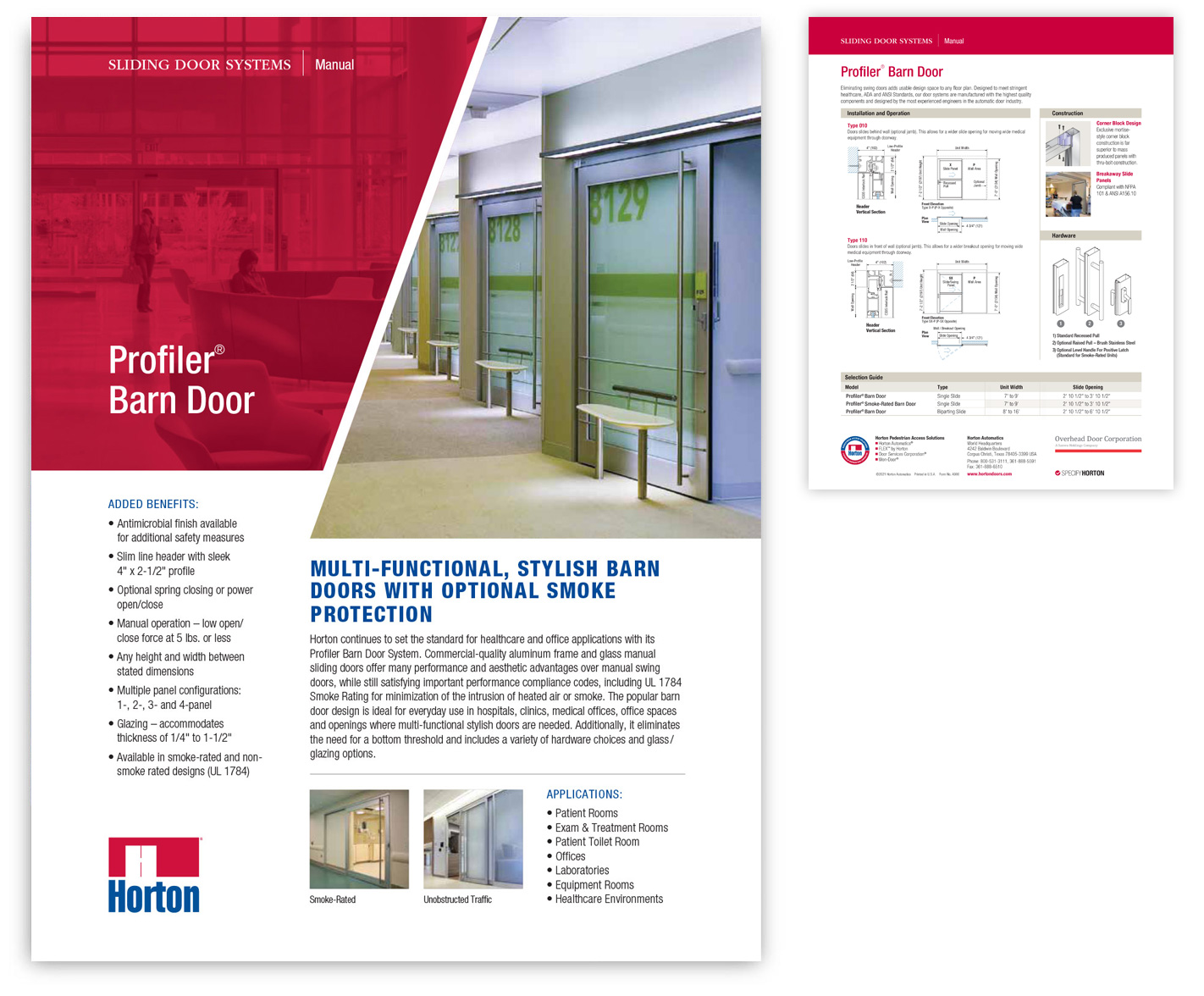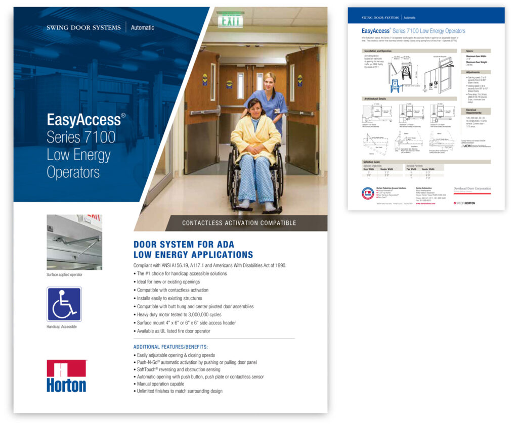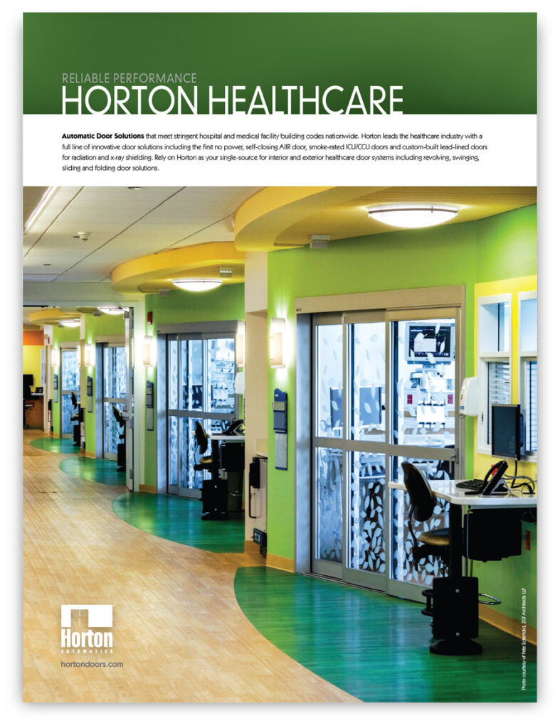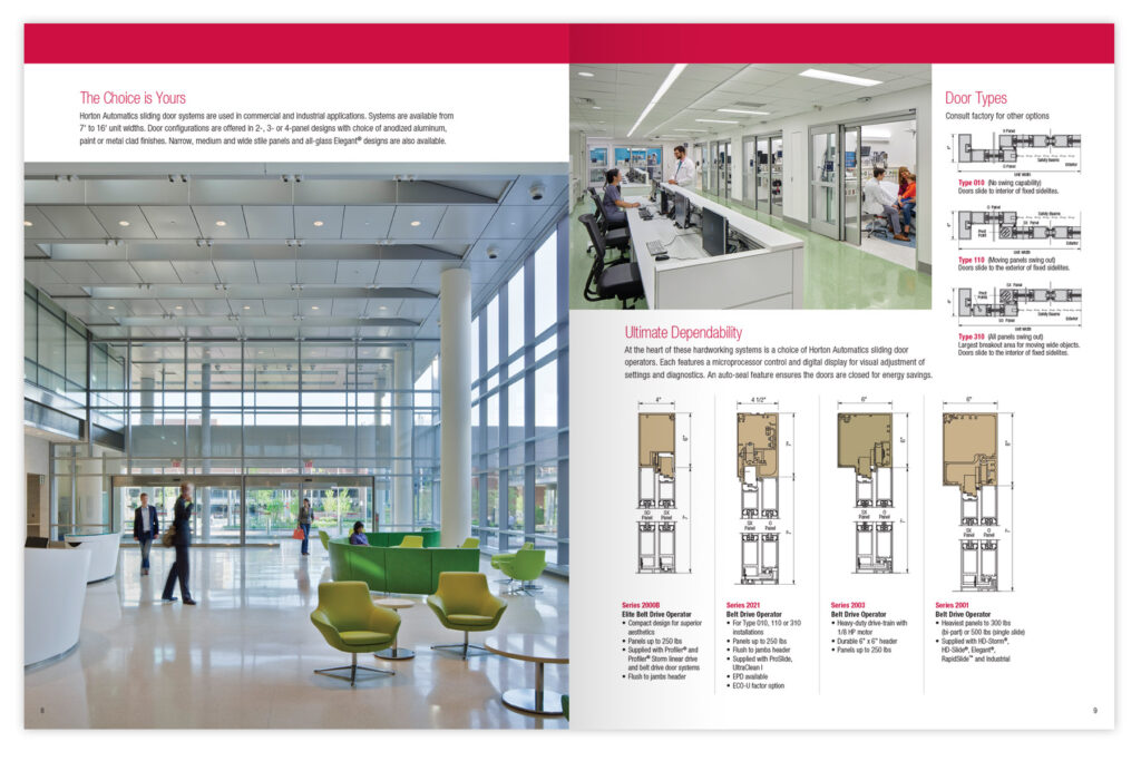 The company that developed the first automatic doors sold in America has been a client for over 15 years. Horton asked us for a refresh on all of their marketing materials from their catalogs and sell sheets to their content marketing and advertising. The goal was to elevate their brand position in the market. To achieve this, we used converging parallelograms to create a sense of motion and forward thinking. Bold brand colors and dynamic photography enhances the premium product.