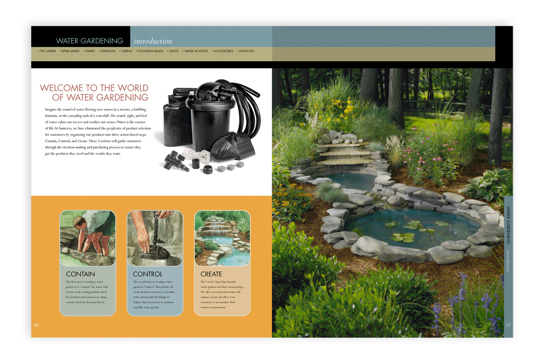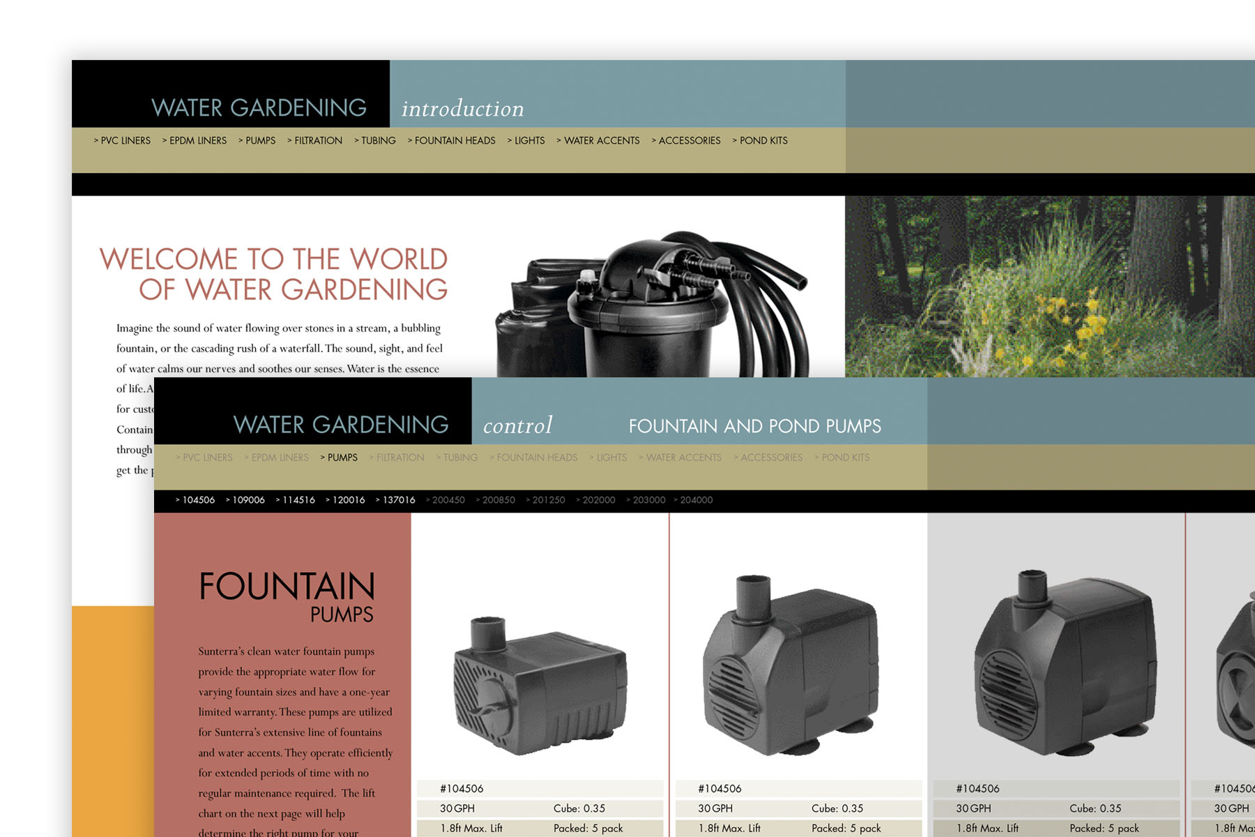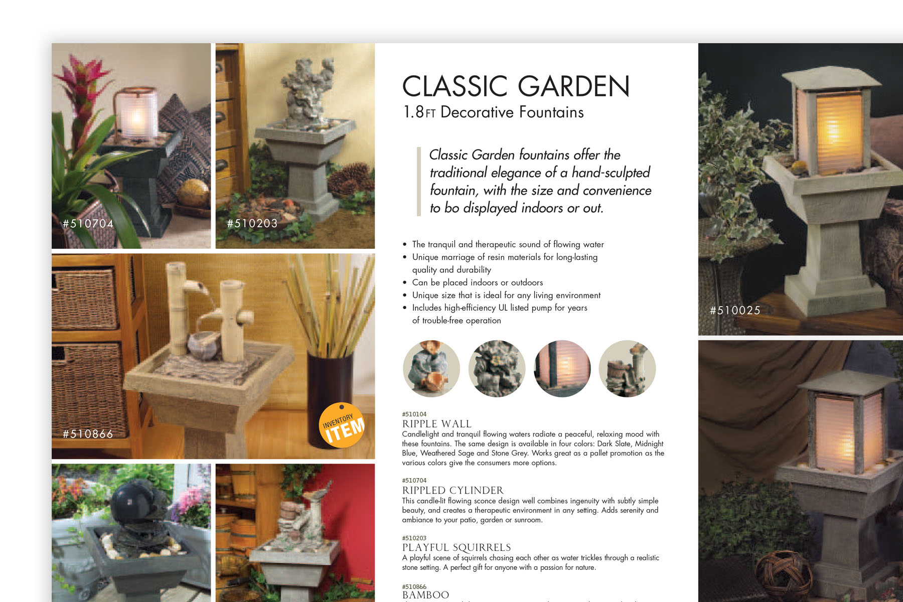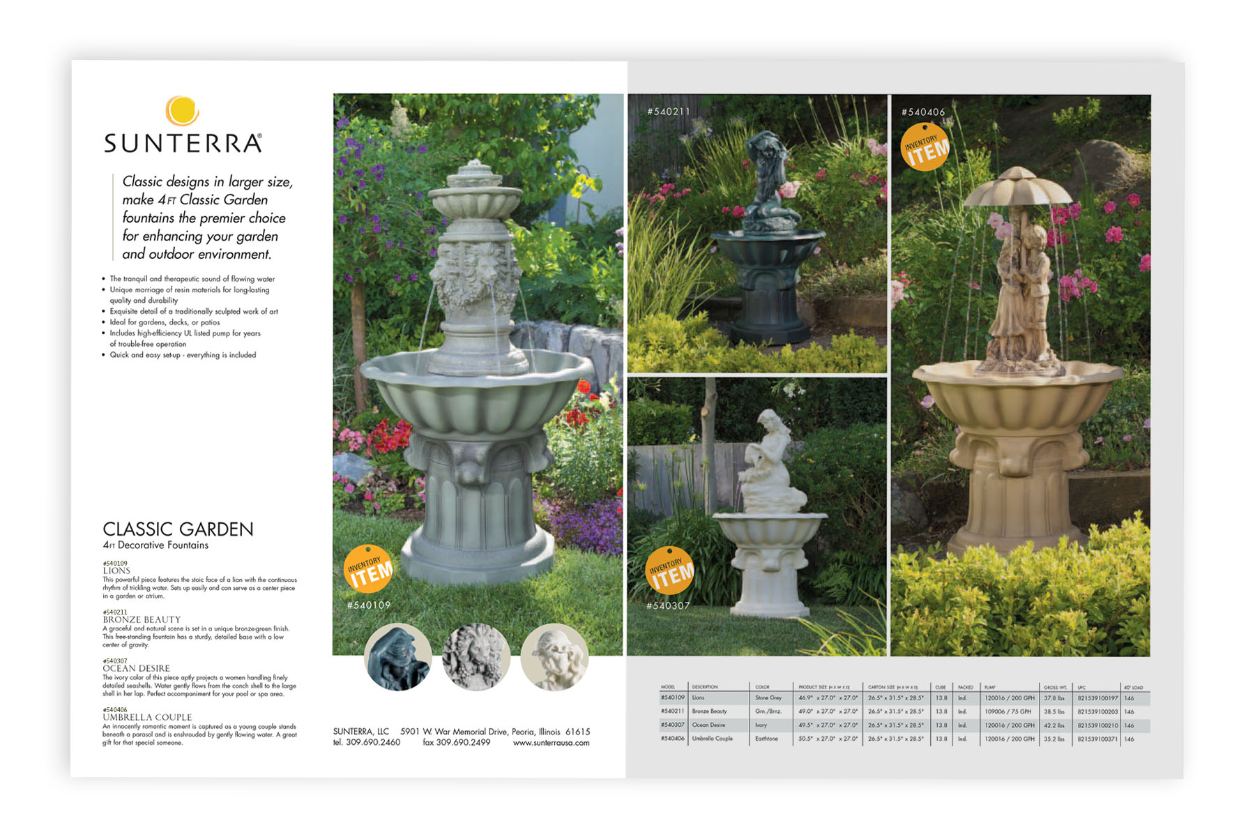 A division of the LR Nelson Corporation, Sunterra USA began selling decorative water fountains. We helped bring these water fountains to market by creating catalogs, instructions and packaging. After developing eight groupings of fountains, Sunterra USA further expanded by adding Water Gardens products to their lineup. These products include pond liners, pumps, filters, tubing, lights, accessories and decorative fountains. We were instrumental in developing a full line of products (57) for Menards within a three month window.