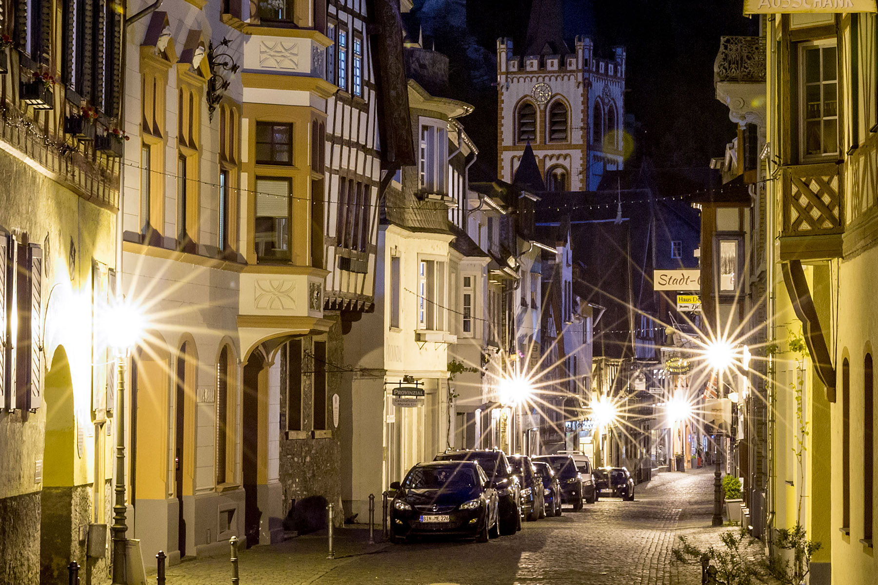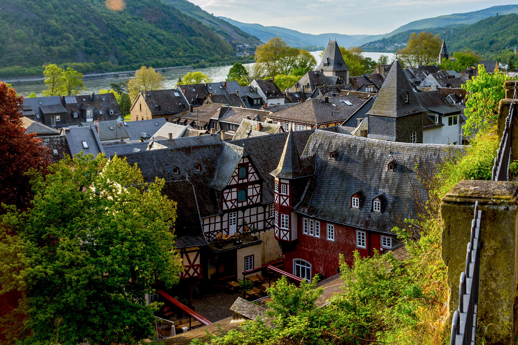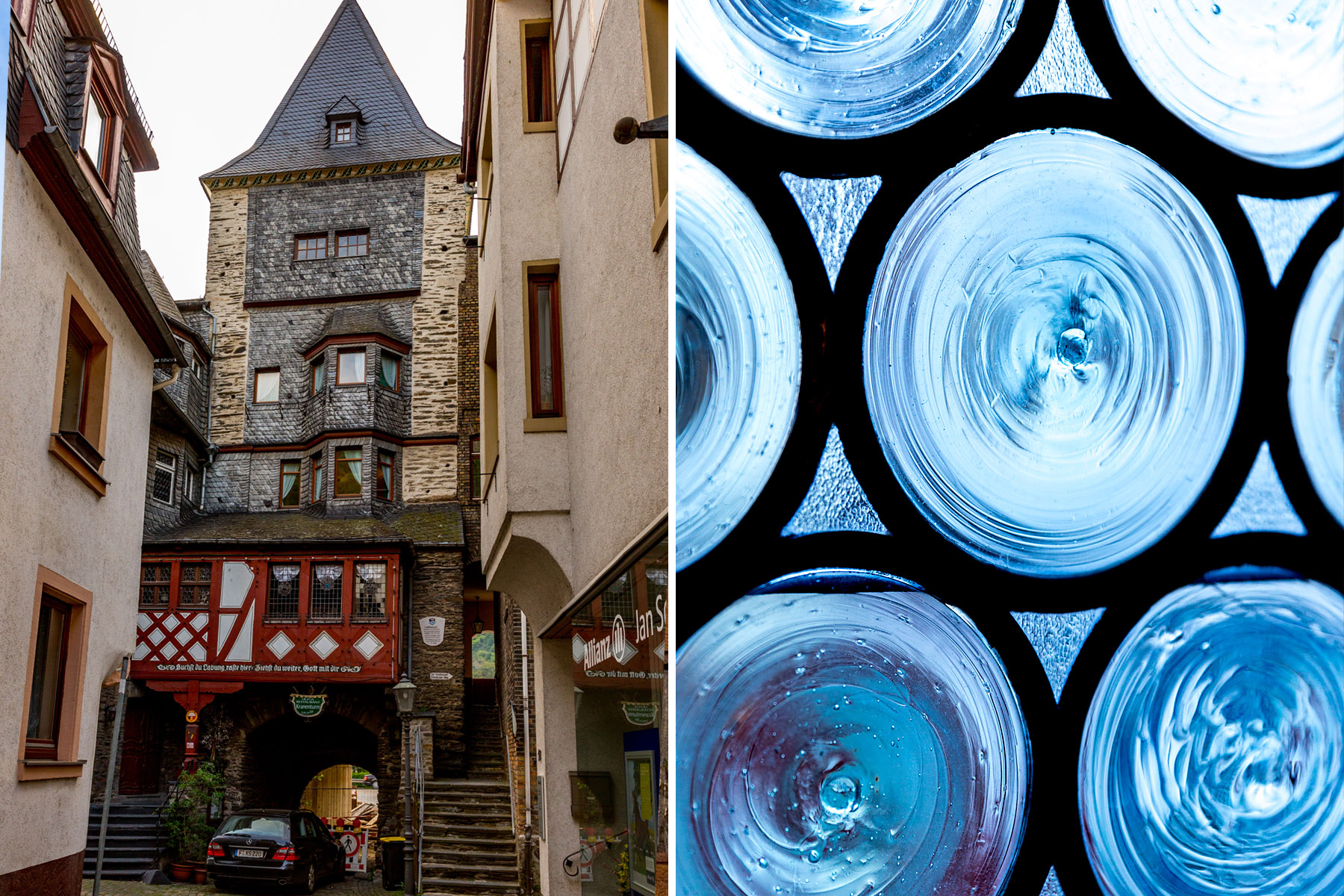 The town name likely derives from “alter to Bacchus,” the roman god of the grape harvest, wine making and wine, ritual madness, fertility, theatre and religious ecstasy. Sounds like a fun place. We found Bacharach to be a half-timbered village on the Rhine river. We stayed at the historic Hotel Kranenturm with it’s castle ambience. The hotel was part of the medieval town wall but it was 15 feet from the train tracks.