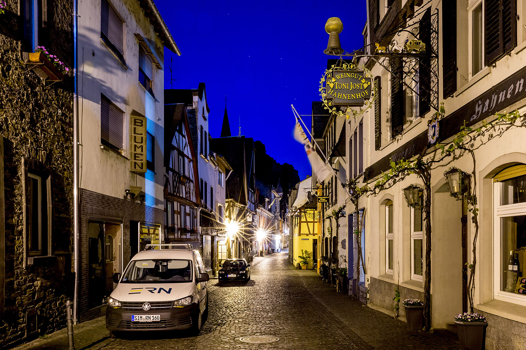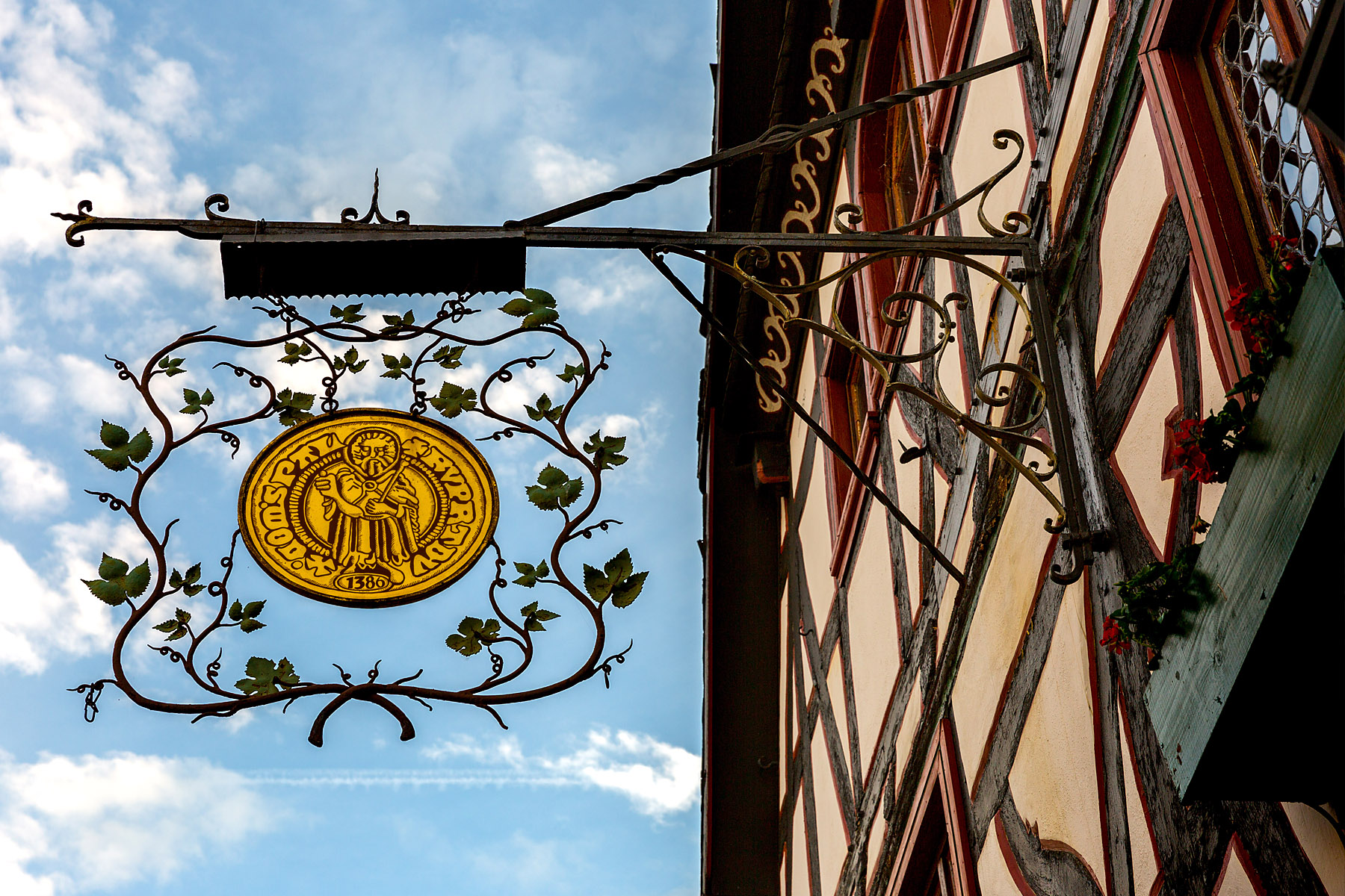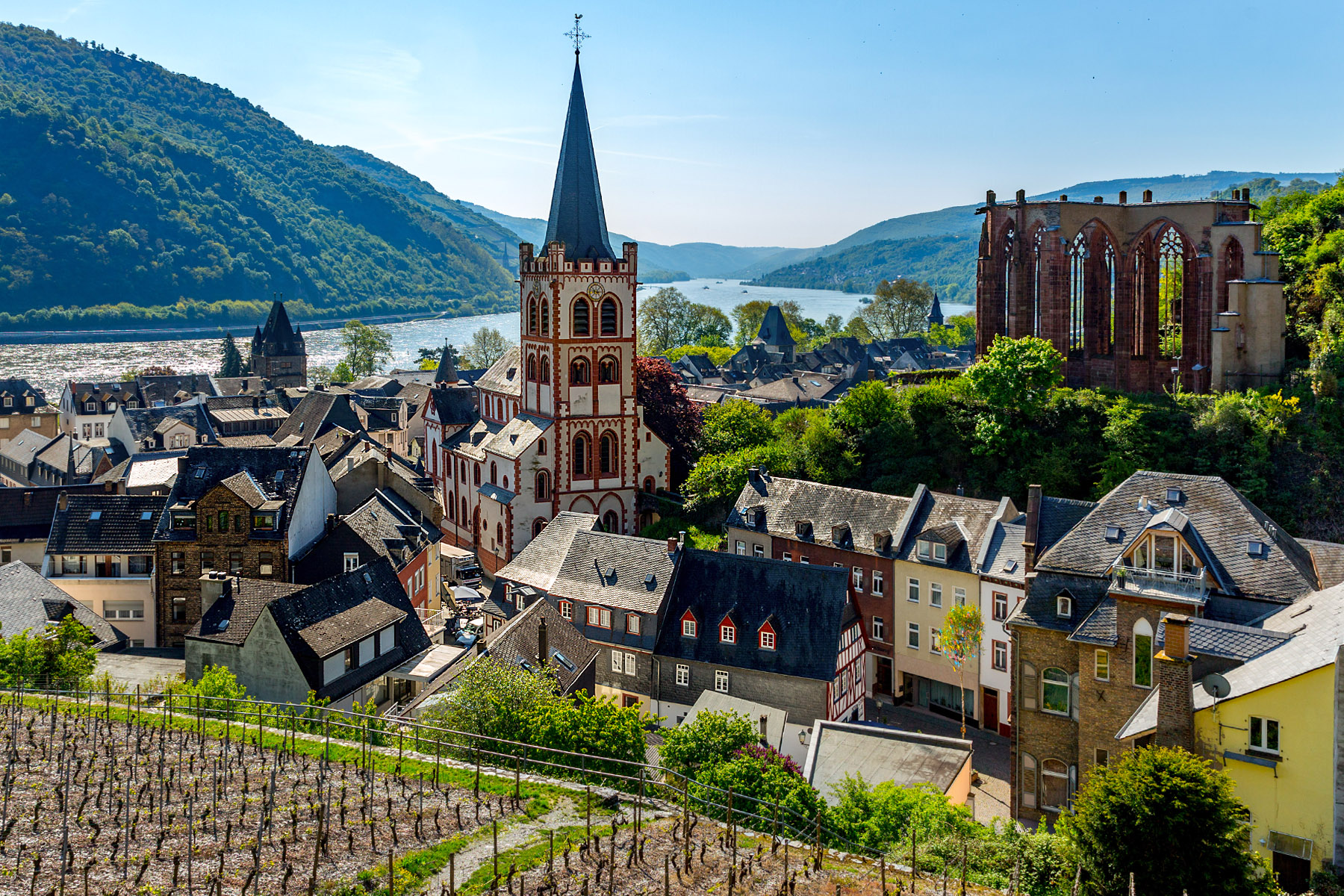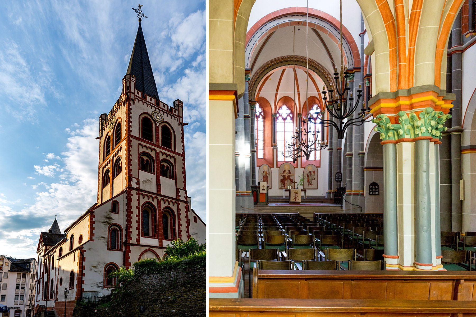The town name likely derives from “alter to Bacchus,” the roman god of the grape harvest, wine making and wine, ritual madness, fertility, theatre and religious ecstasy. Sounds like a fun place. We found Bacharach to be a half-timbered village on the Rhine river. We stayed at the historic Hotel Kranenturm with it’s castle ambience. The hotel was part of the medieval town wall but it was 15 feet from the train tracks.